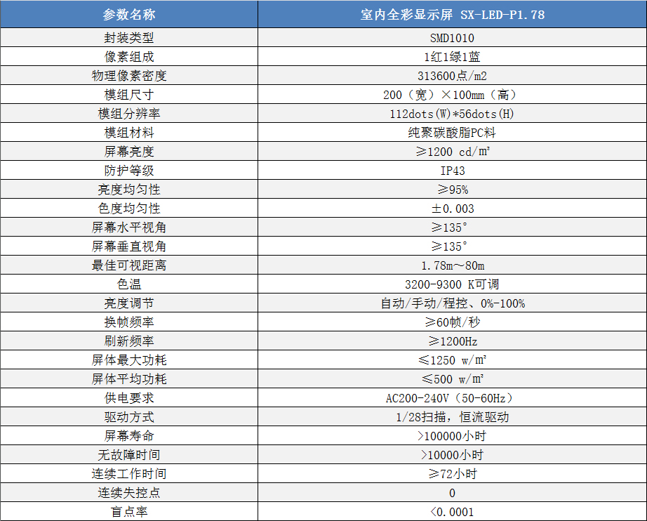 P1.78室內小間距高清全彩LED顯示屏技術參數: