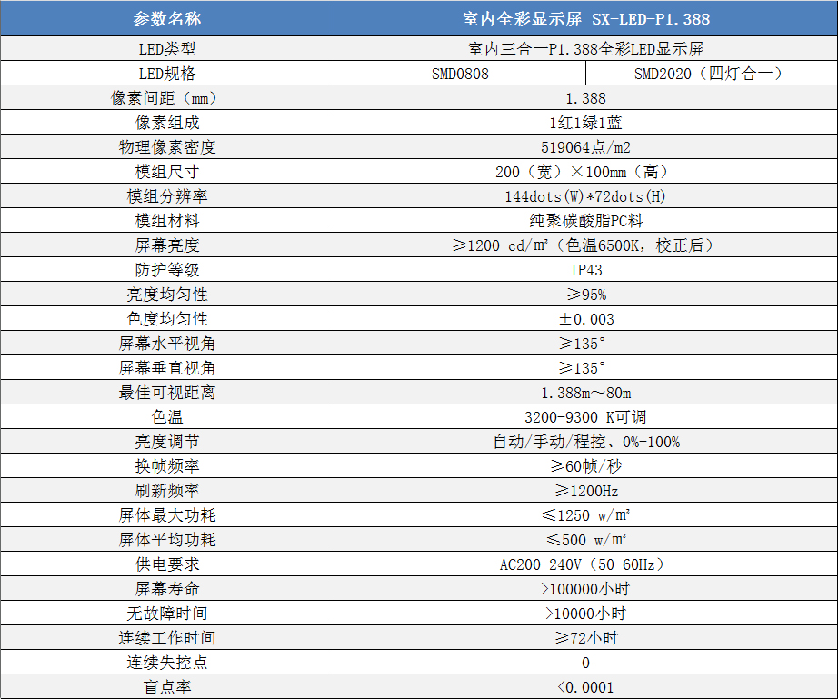 P1.388室內(nèi)小間距高清全彩LED顯示屏技術(shù)參數(shù):