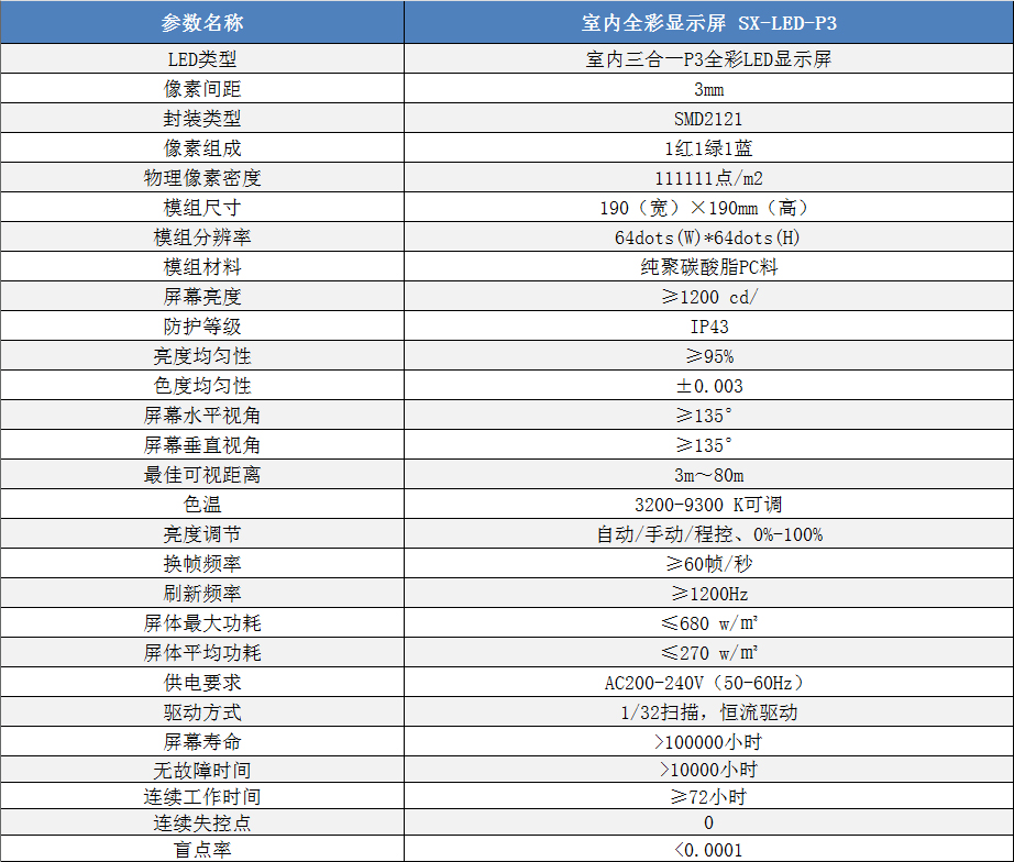 P3室內(nèi)小間距高清全彩LED顯示屏技術(shù)參數(shù):