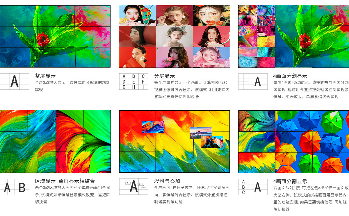 ②智能拼接,任意組合:客戶需求,怎么顯示怎么來;個性化個性設(shè)計、靈活多變、滿足不同需求、支持定制;多樣化的圖像拼接顯示,可以整屏顯示、分屏顯示、多畫面分割顯示、區(qū)域顯示加單屏顯示相結(jié)合、漫游與疊加。
