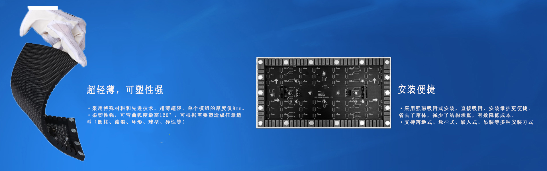LED無縫拼接軟屏也稱作柔性LED顯示屏,采用特殊材料和先進技術,超薄超輕,單個模組的厚度僅8mm,不僅輕薄,可塑性強,該系列LED軟模組屬于異形LED大屏,采用可彎曲pcb和硅膠底殼套件,柔韌性強,可彎曲弧度最高120°,可根據需要塑造成任意造型(圓柱屏、波浪屏、環形屏、球型屏、彩帶屏弧形屏等顯示場合)
